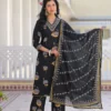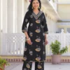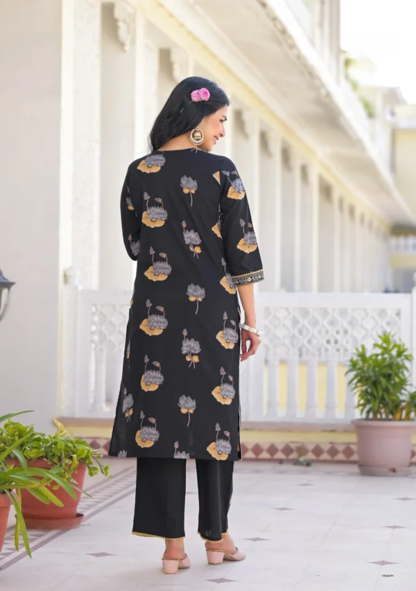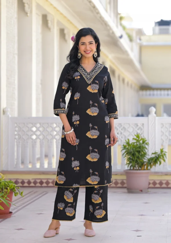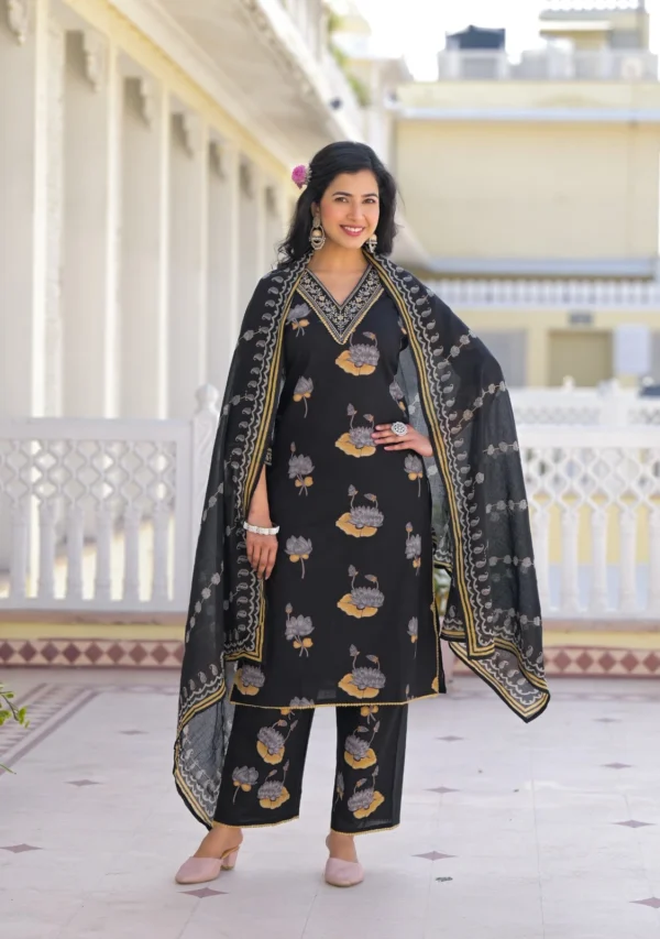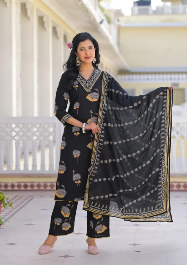 Crafted from breathable cotton fabric, this beautiful black kurti set features delicate floral prints and subtle embroidery on the neckline. Paired with comfortable straight pants and a lightweight printed dupatta, it creates a graceful look perfect for everyday wear and special moments.